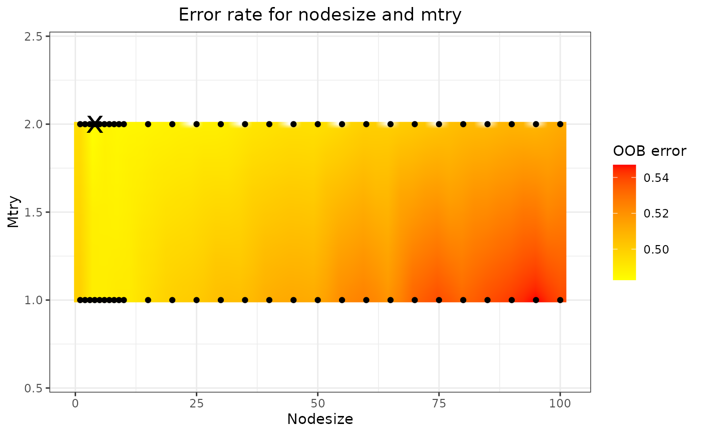 logical. Determine whether nodesize and mtry should be tuned. Nodesize is the minimum size of terminal nodes, mtry is number of variables to possibly split at each node. If FALSE, nodesize = 15 (for regression), and mtry = number of x-variables / 3 (for regression). Default is FALSE.